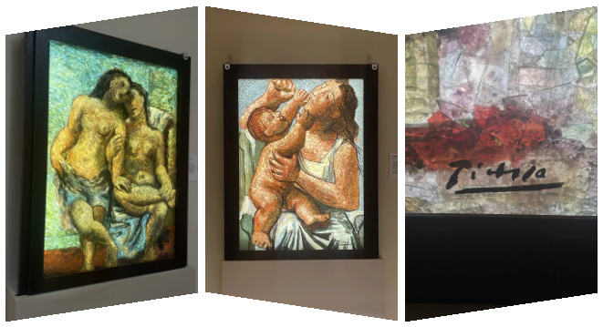 如果说1层的玻璃画像都还是习作,那么登至2层,毕加索肉眼可见地“玩”开了,从完美体现其立体主义精神的《阿尔及尔的女人》,到战争题材的《鸽子静物画》《猪笼草与番茄盆栽》,再至融进毕加索西班牙血液的斗牛竞技《斗牛》,古稀之年的老艺术家完完全全掌握了玻璃画的创作形式。