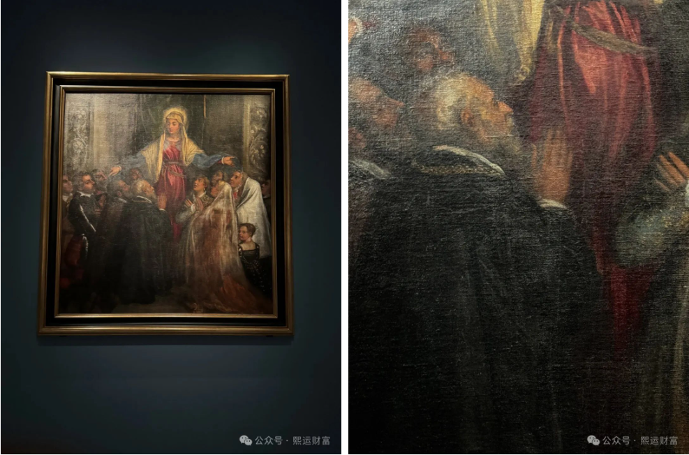 在意识流艺术还没被发明的时候,老画家们笔下描绘宗教、历史、权贵的故事,画家本人的思想情感只是绘画中可有可无的调味品。但通过发现画家本人的“小私心”,可以了解到他在当时的社会地位。专题展中第一张提香的作品《慈悲圣母》就是如此:红衣圣母将斗篷覆盖跪在她面前的信徒,代表圣母玛利亚对众生的庇佑,然而提香在左下角画入了自画像,身穿黑色斗篷,佩戴金银珠宝,暗示自己的财富和地位。