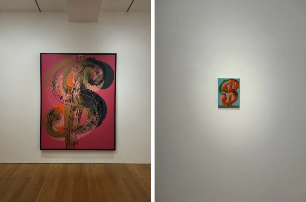 《美元符号》同样是沃霍尔非常有代表性的作品。在世界上的一切都开始被美元化的时候,尤其是在金本位被取消之后,所有的生产劳作、所有的商品交换,都要以某种方式折合为美元来确立价值。