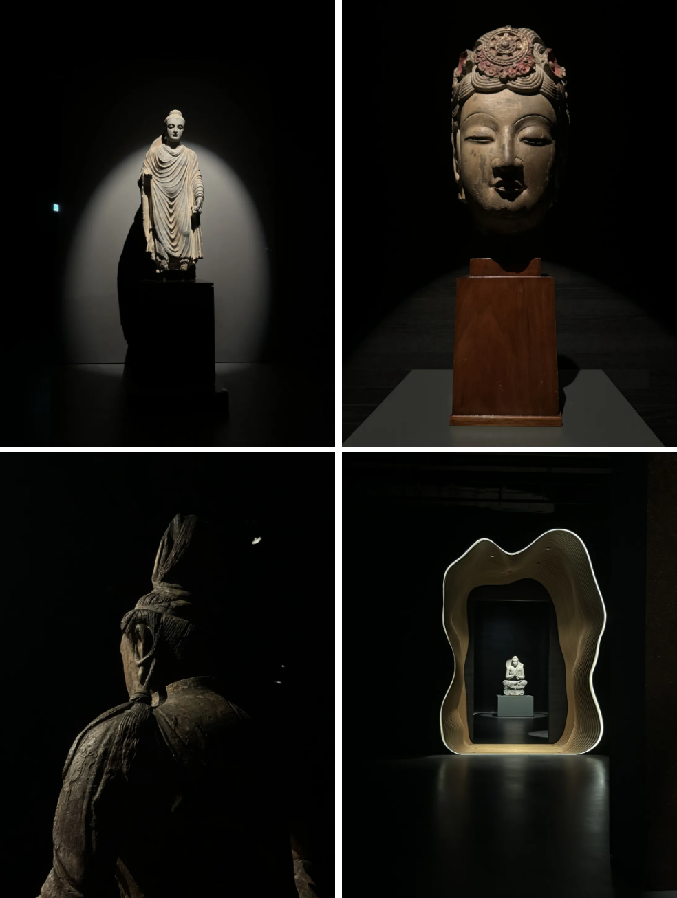 由于展厅圆弧型的结构,从进门开始,观众会不自觉地以顺时针走到佛像及展品跟前。每尊佛像的打光会根据材质、高度夺定,一些打在佛像面部,一些会使用墙面反射光,形成神圣的光环。与此同时,灯光让多个展区连接在一起,能够指引观众有方向地探寻。
