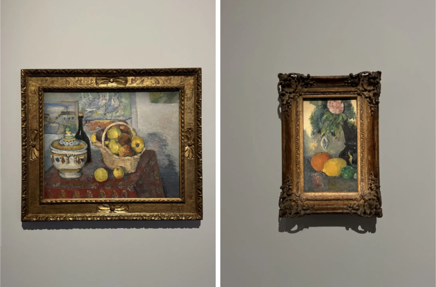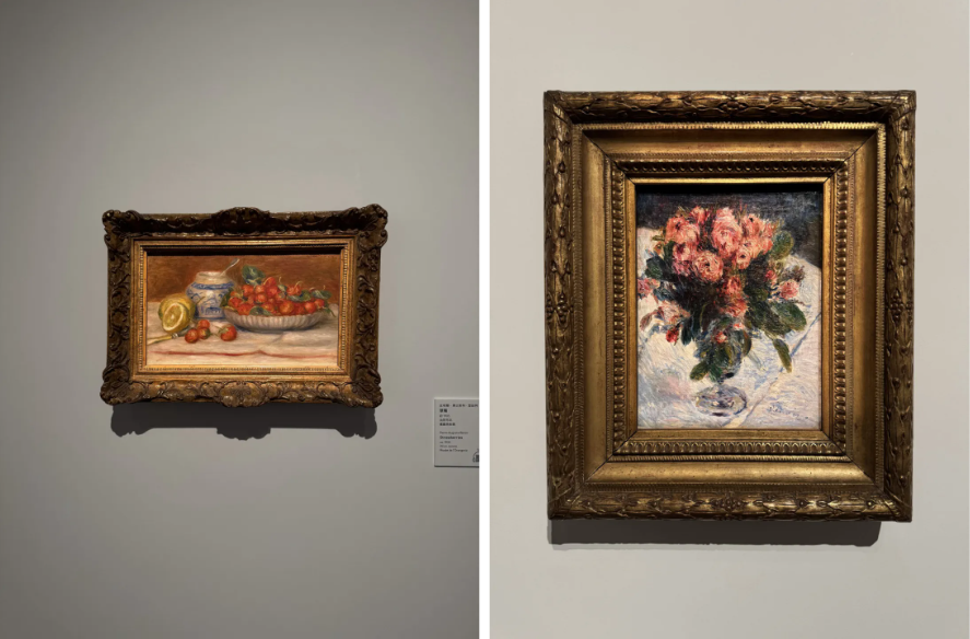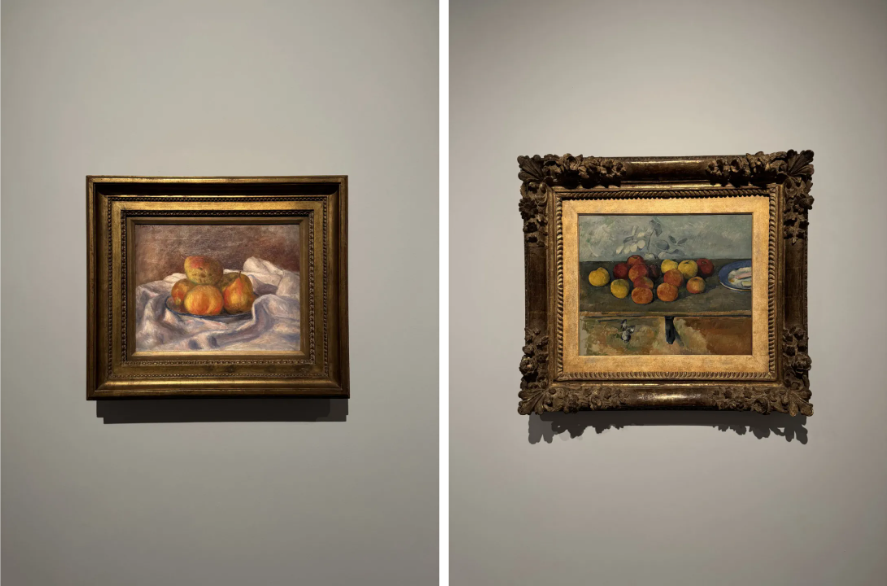 没等小编消化好巨匠这一番“镇场”的名言,展览就把观客的脚步引至了馆内。开头先为客人们上“餐前水果”:雷诺阿端来《苹果与梨》,堆叠出造型的白布中放入蓝边瓷盘,盘中果实在雷诺阿费心营造的光影中显得秀色可餐;另一边保罗·塞尚呈上《苹果与饼》,他使用独特的笔触和精准的渐变色体现出苹果的立体饱满,再以桌面、饼盘、花卉为背景,以虚辅实。
