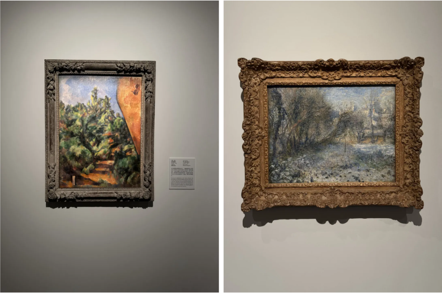 户外写生是印象派的一大特色,印象派画家着重捕捉景物在不同时间、季节和天气下瞬息万变的面貌。塞尚与雷诺阿的风景画各有千秋,例如塞尚成熟期的名作《红色岩石》,描绘了普罗旺斯埃克斯附近的比贝穆斯采石场的荒凉景观,以奇特的“割裂感”构图和大胆交错的笔触开创了一种全新的风景画。雷诺阿则创造出了《雪景》,运用极其细致的描绘笔法和精准的色彩表现,将阳光、积雪、密林草木、远处古堡等表现得淋漓尽致。