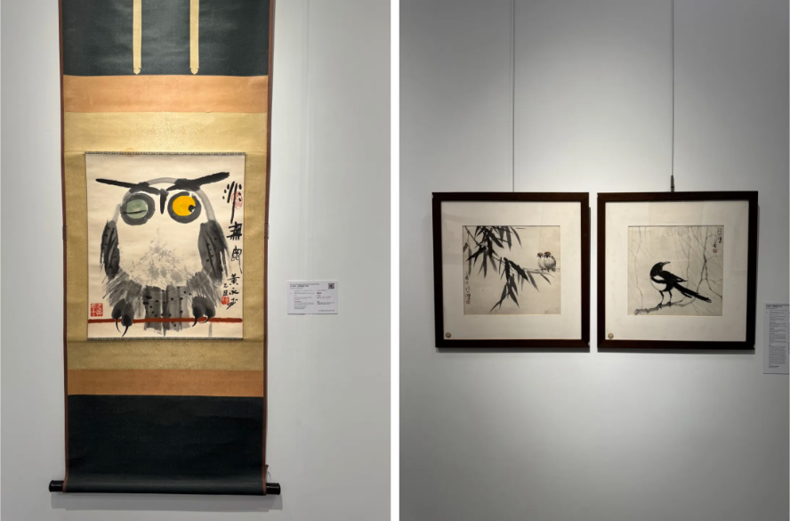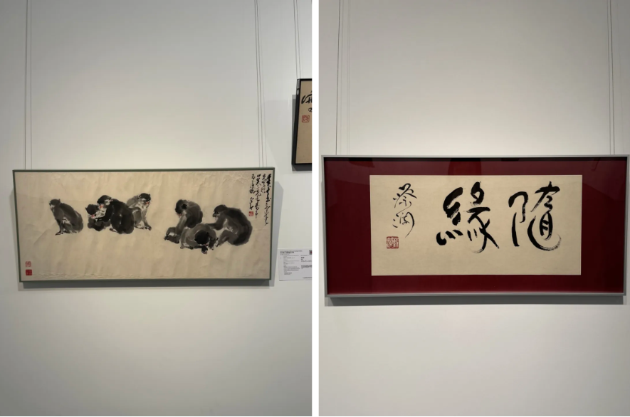 进门首先可见赵少昂的小品组画《朱顶兰螳螂/文雀紫藤》,两幅小品以画面主体的方位及走向为基准,对照摆放,《朱顶兰螳螂》的画面主体由左上至右下,延续《文雀紫藤》由右上至左下的走势,绘法采用了中国水墨画的传统技艺——没骨法,不勾勒轮廓,直接以彩墨塑形,色彩现代、笔触熟稔,大师的底蕴可见一斑。