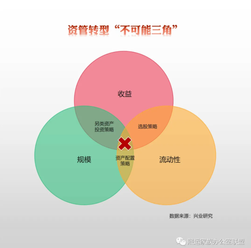 在资产管理领域存在一个“不可能三角”,即高收益回报、资产高流动性、规模壮大三者目标难以兼得,这也是当下银行理财、信托转型需要解决的核心矛盾:资产与策略如何选择。