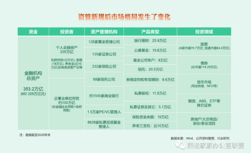 编者按:2021年5月创刊的《熙运传承金融院专刊》,聚焦国内国际资产管理行业、全球财富管理和私人银行的趋势资讯与致胜战略,专注为熙运资产的家族投资伙伴与理念同频的关注者,精读、梳理和整编财富管理行业相关文献,以啻共同拓展视野、深化思辨、打磨业力、提升洞见。创刊号文章选编分享了「中国财富管理50人论坛」课题组的《资管新规三周年回顾与展望》,为大家带来了新规发布以来的“三新”概况(新模式、新产品、新格局),本期将就此话题推进更深一步的解读和思考。从2018年4月27日至今,资管新规已成为行业的转型纲领 —— 推动资产管理行业乃至金融领域的发展转型,防范化解金融系统性风险,具体体现在:第一,资管行业去通道、去嵌套,弱化刚兑预期;第二,资管产品净值化、资产配置标准化;第三,居民财富配置产品化,金融和资本市场加速机构化。