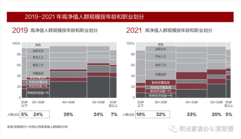 随着部分一代创业者开始传承规划并步入退休期,二代继承人逐渐成熟,中国企业逐渐开始交接,传统经济创富一代在40岁以下高净值人群中比例正持续下降。